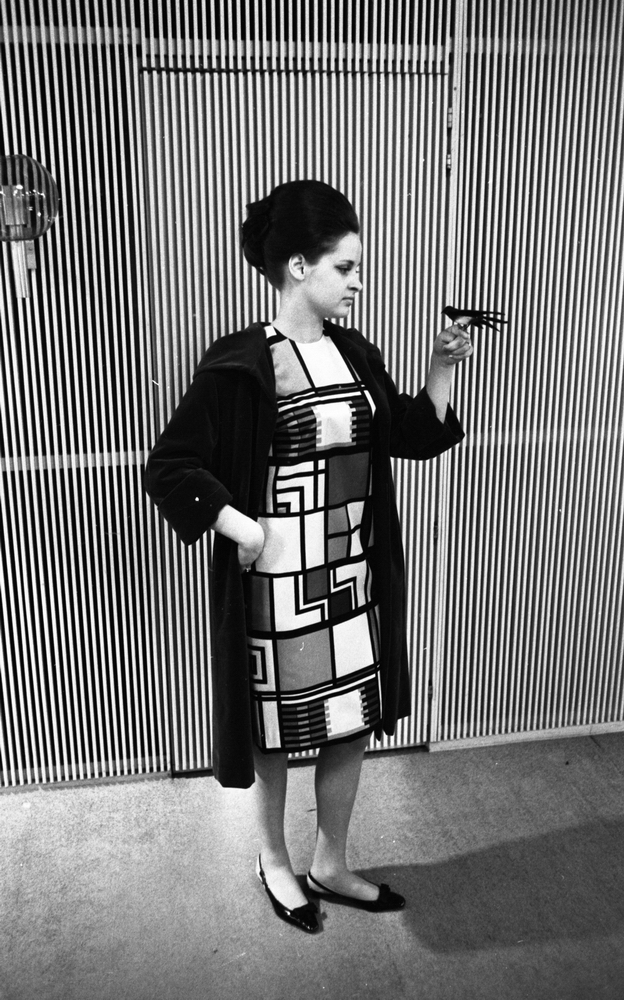 En mannekäng med kort ljus klänning med mörka kvadrater på, svart kappa och svarta skor håller en konstgjord fågel i sin vänstra hand. Hennes hår är uppsatt. Bakom henne syns en randig vägg med randig dörr på samt en lampa på väggen.