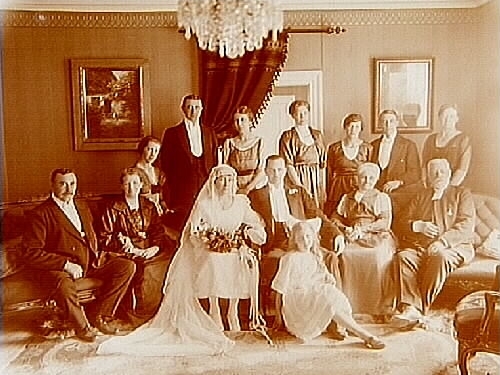 Bröllop. Brudpar och 12 bröllopsgäster.
