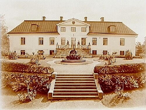 Hjälmarsbergs Herrgård, tvåvånings herrgårdsbyggnad med frontespis och inredd vind, trappa upp till ingången.