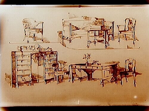 Titel: Erik Janssons Möbleringsaffär, möbler: bord, stolar, skrivbord, soffgrupp, bokhylla.