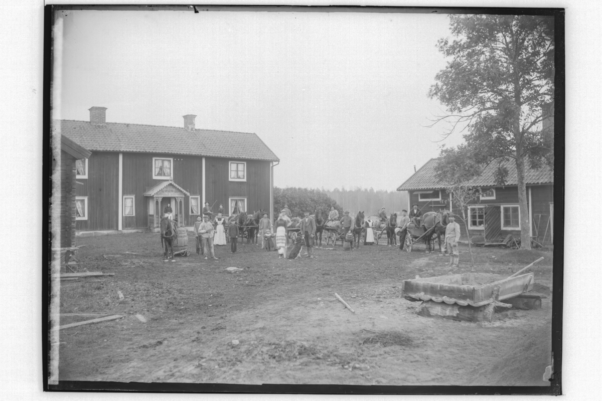 Byggnader, 20 personer. Tvåvånings parstuga, uthus. Sju hästskjutsar med ölfat.