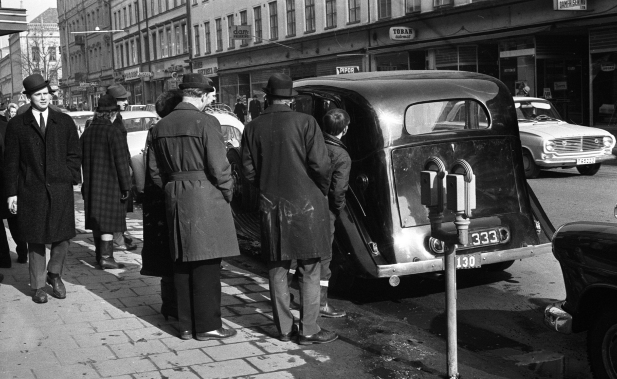 Titel: Rolls Royce 15 mars 1965. Fotgängare stannar vid den parkerade bilen.