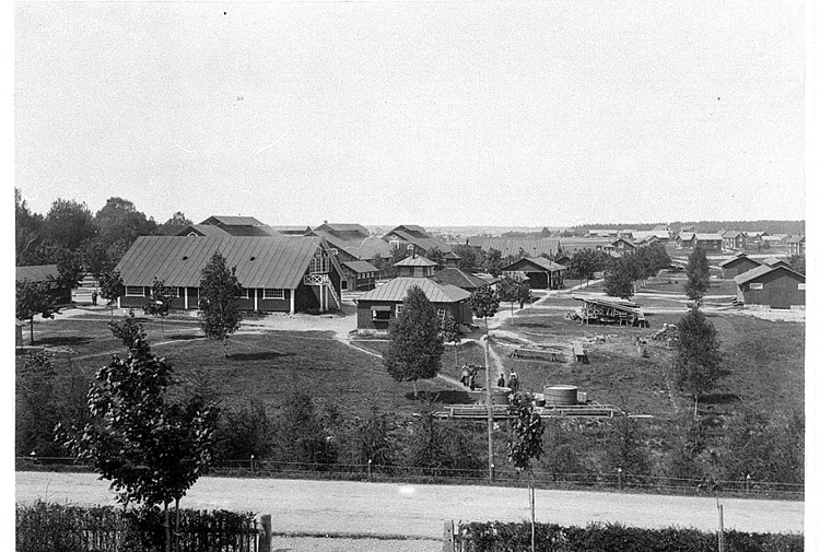 Sannahedlägret 1893. Bilden är tagen från öster. De två första mathallarna är nyligen uppförda.