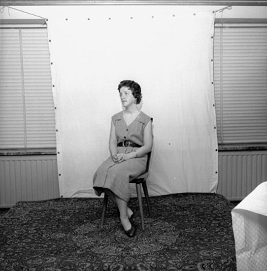 Titel: Hårdemonstration (modevisning) på hotell Laxbrogården i Kopparberg, en kvinna.