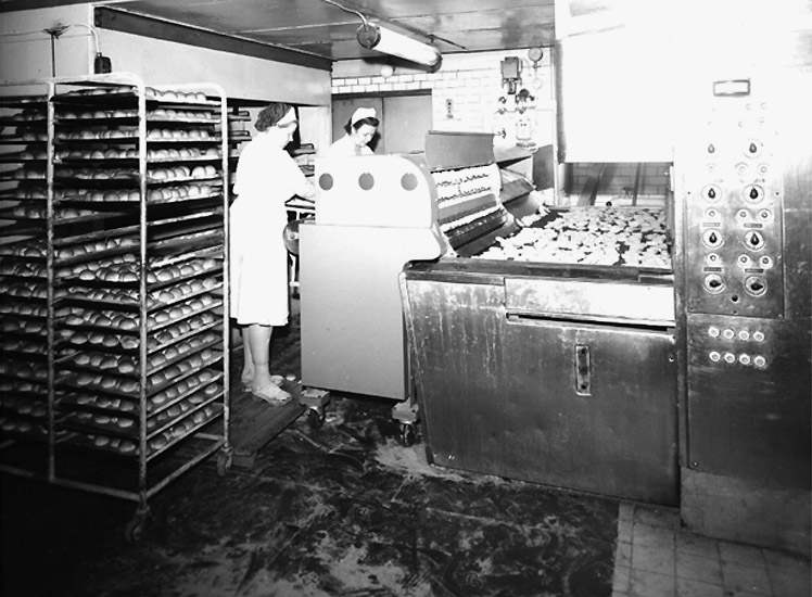 Titel: Konsum bageriet, interiör, två kvinnor. Skorpmaskinen kommer från Nordbo Mekaniska Verkstad, Oslo, Norge.