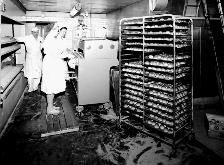 Titel: Konsum bageriet, interiör, tre personer. Skorpmaskinen kommer från Nordbo Mekaniska Verkstad, Oslo, Norge.