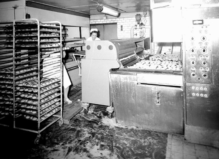 Titel: Konsum bageriet, interiör, två kvinnor. Skorpmaskinen kommer från Nordbo Mekaniska Verkstad, Oslo, Norge.