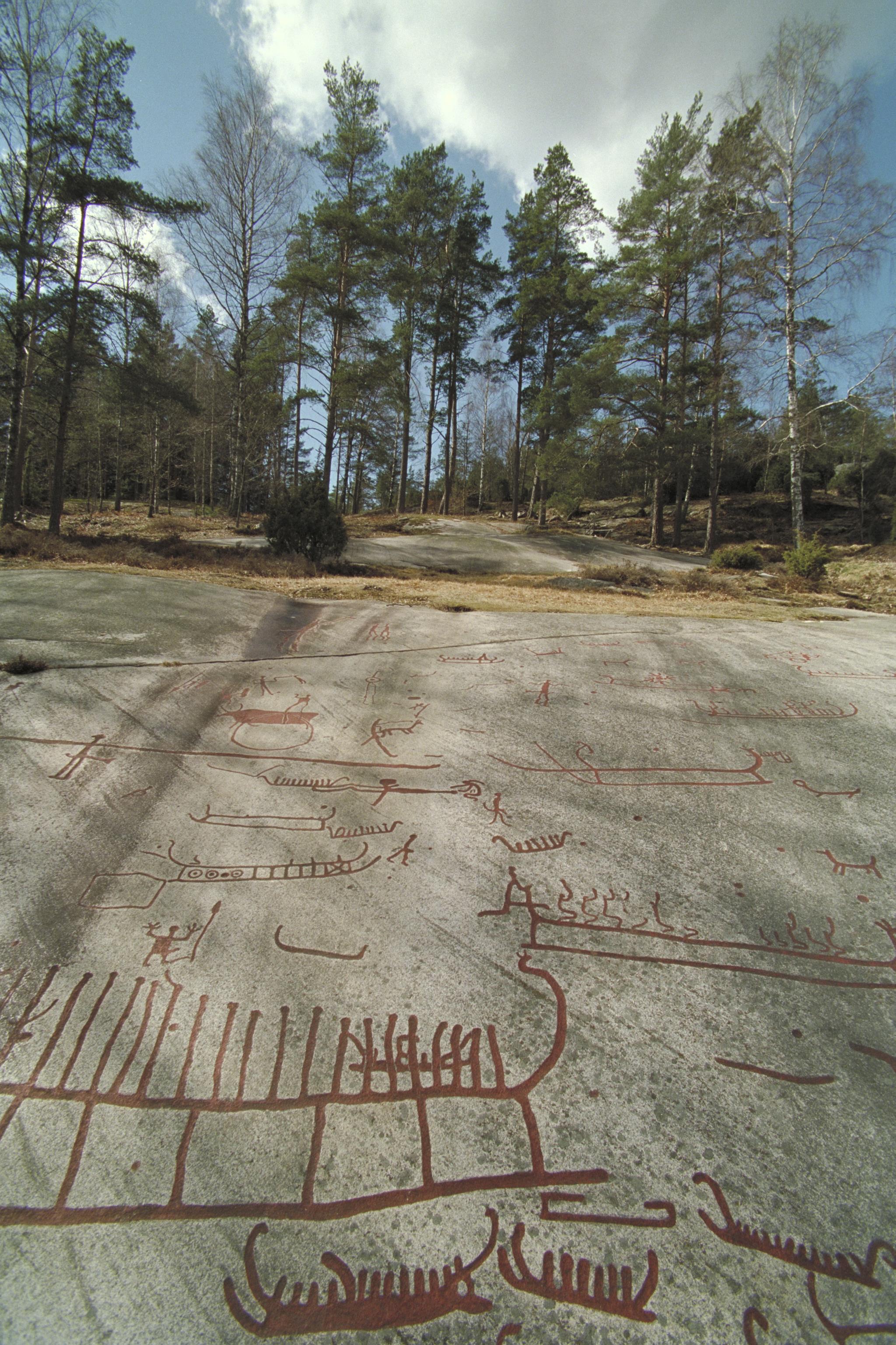 Vårlandskap i fonden. Skepp större och mindre, konturristade eller helt uthuggna, samt med bemanningsstreck. Vitlyckehällen, Tanum 1:1.