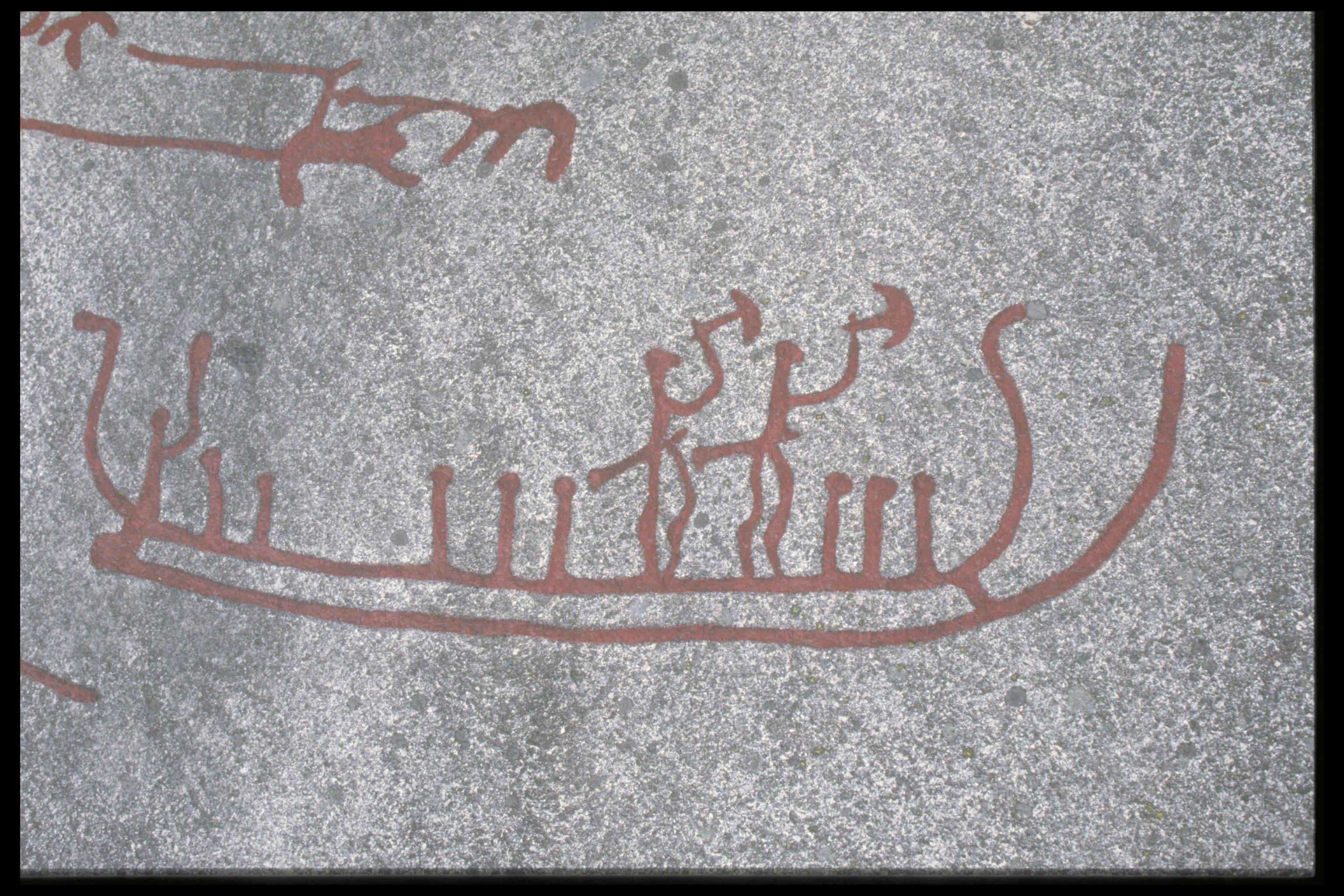 Skepp, dubbellinjigt med bemanningsstreck och två ståendes människor med svärd, och höjda ceremoniyxor. Vitlyckehällen, Tanum 1:1.