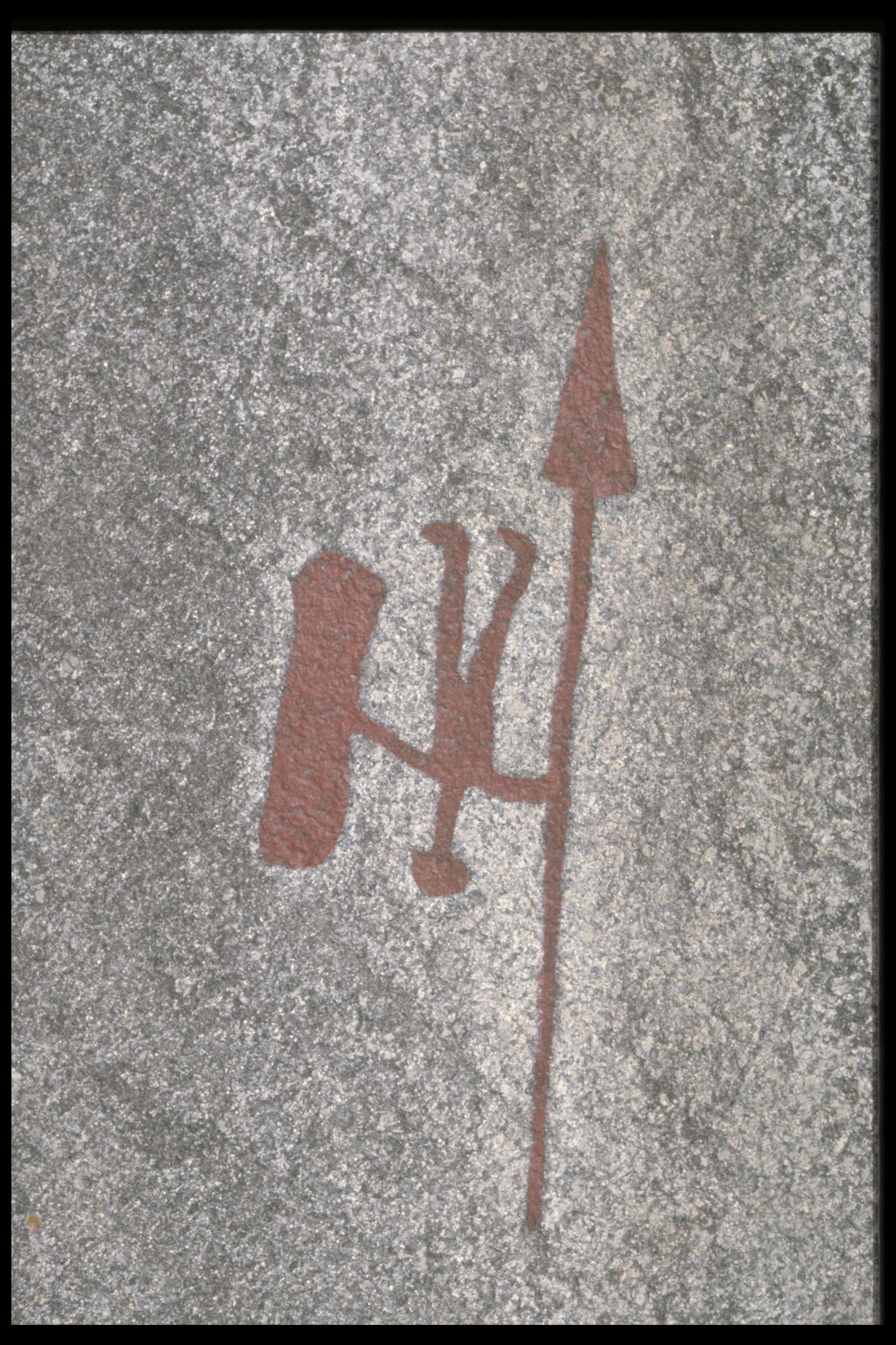 Människofigur, med långt spjut och sköld. Vitlyckehällen, Tanum 1:1.