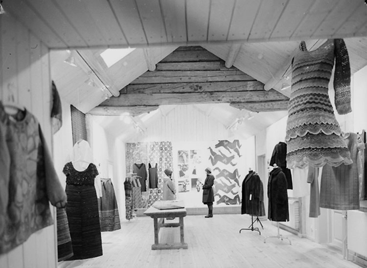 Klädutställning i Wadköping, interiör av utställningssalen, två kvinnor.