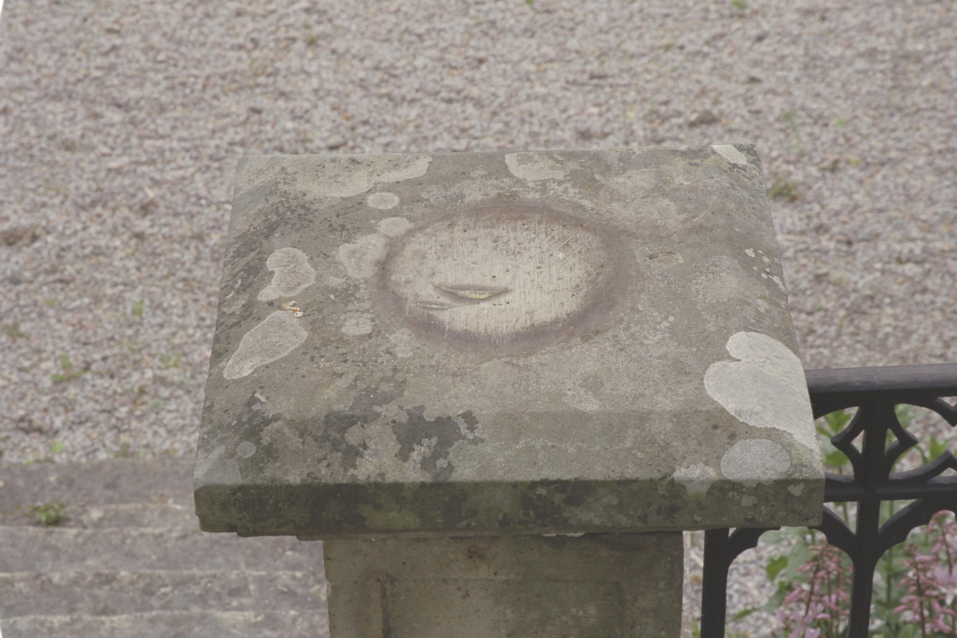 Huvudbyggnadens östra fasad, altantrappans södra postament.