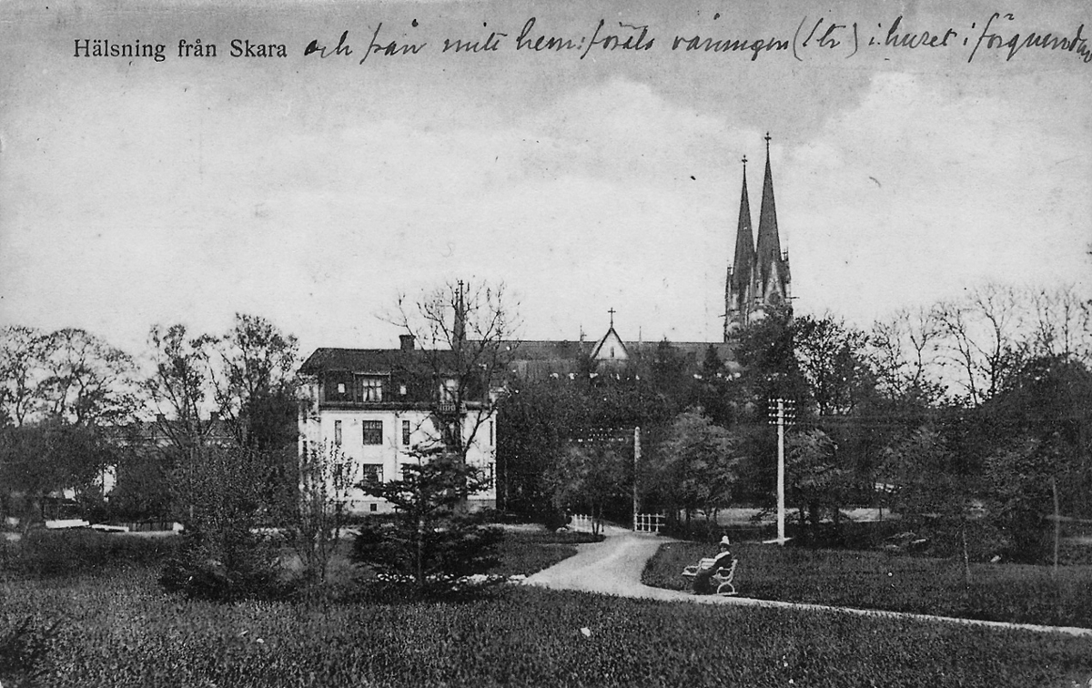 Vykort, Hälsning från Skara. Bostadshus, Skara domkyrka i bakgrunden.