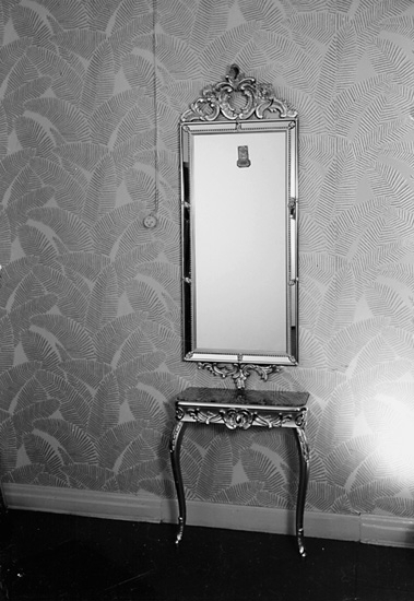 Rumsinteriör, spegel och bord.