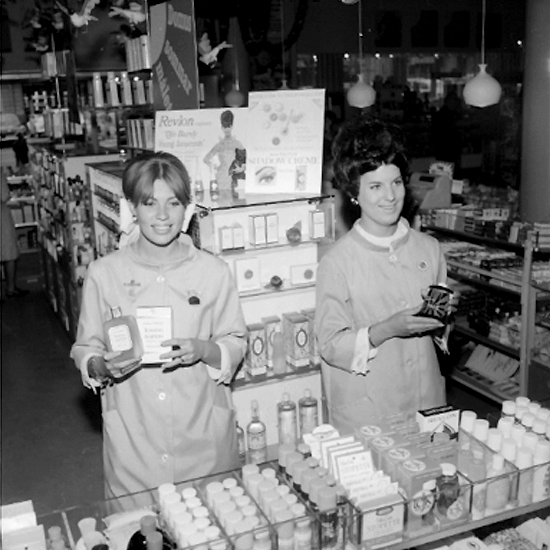 Konsum Domus, affärsinteriör, parfymdisken, två kvinnor.
