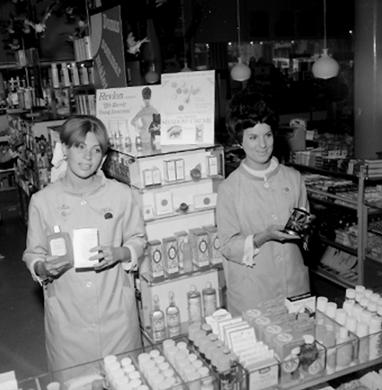 Konsum Domus, affärsinteriör, parfymdisken, två kvinnor.