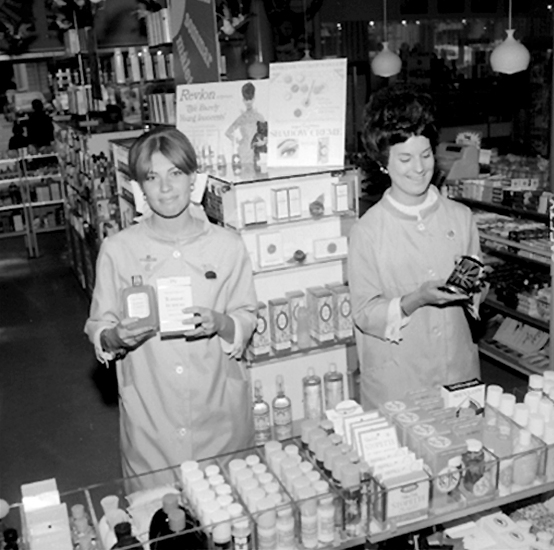 Konsum Domus, affärsinteriör, parfymdisken, två kvinnor.