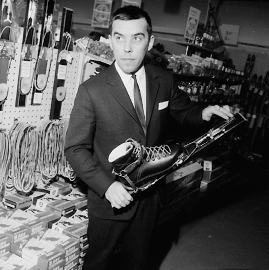 Konsum Domus, affärsinteriör, skidavdelningen, en man.