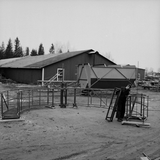 Titel: Vretstorpsverken, fabriksbyggnader, jordbruksredskap, en man.
