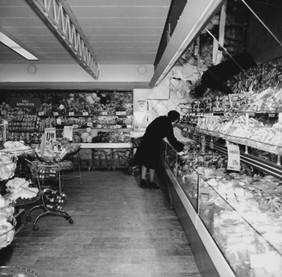 Konsum, affärsinteriör, en kvinna.