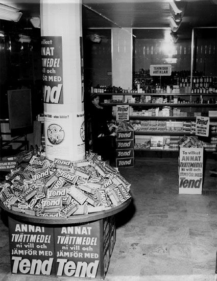 Konsum, affärsinteriör, tvättmedel Tend, en kvinna.