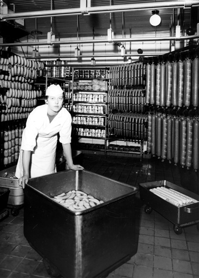 Konsum, charkuteriavdelningen, korvtillverkning, en kvinna.