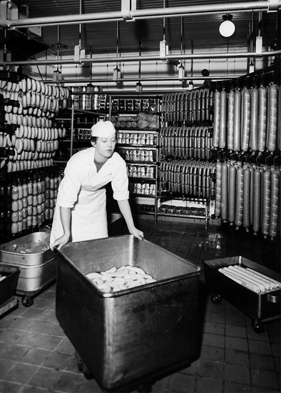 Konsum, charkuteriavdelningen, korvtillverkning, en kvinna.