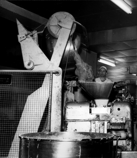 Konsum, charkuteriavdelningen, korvtillverkning, en man.