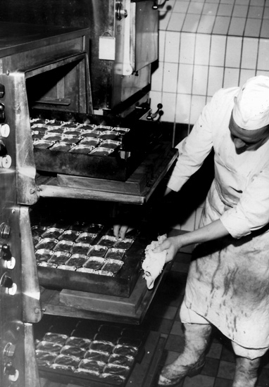 Konsum, charkuteriavdelningen, en man vid ugnen.