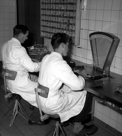 Konsum, affärsinteriör, charkuteriavdelningen, två män.