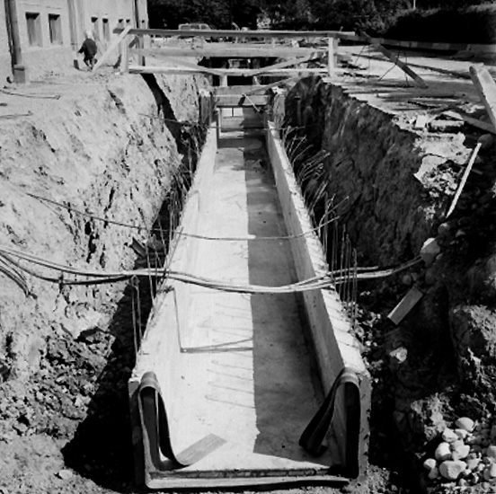 Pågående byggande av en cellbetongisolerad fjärrvärmekulvert vid Slottsgatan 39-41. Rördimensionen är 350 mm.
