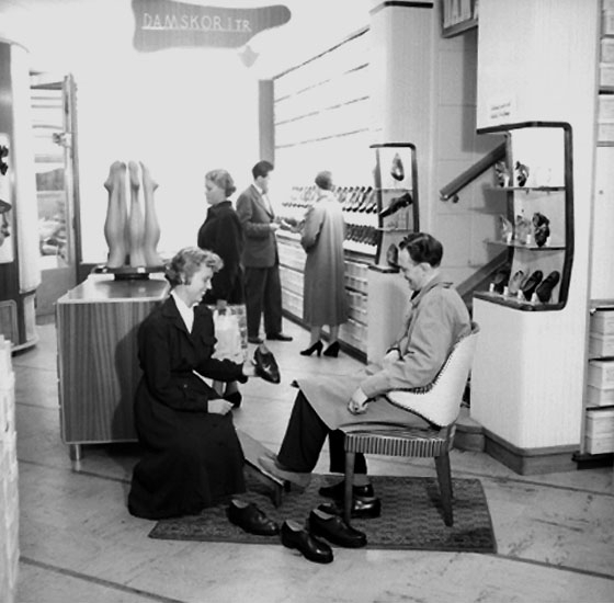 Oscaria, affärsinteriör, skoprovning, fem personer.