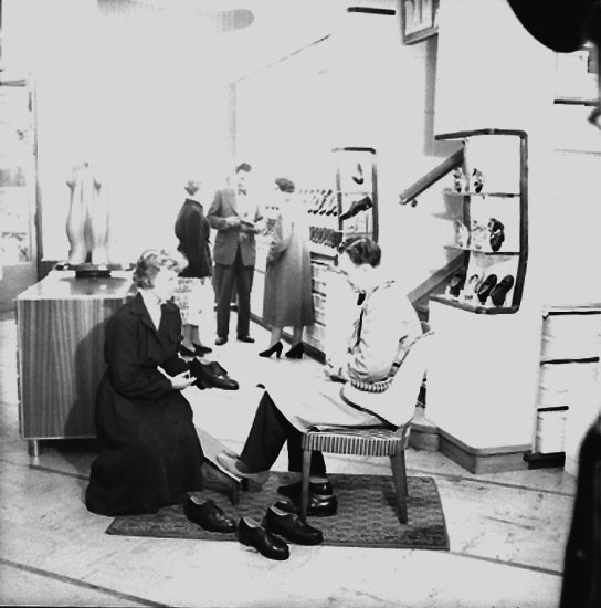 Oscaria, affärsinteriör, skoprovning, fem personer.