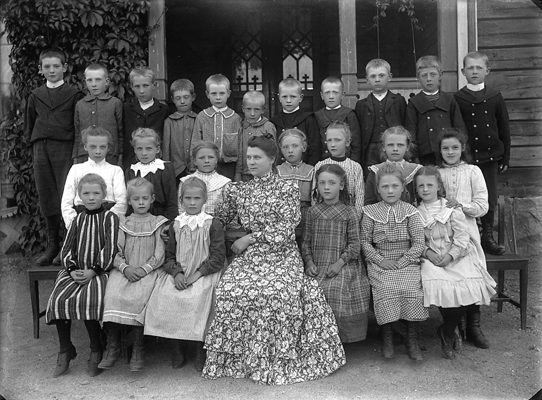Skolbarn med lärare. Skolbyggnad i bakgrunden.