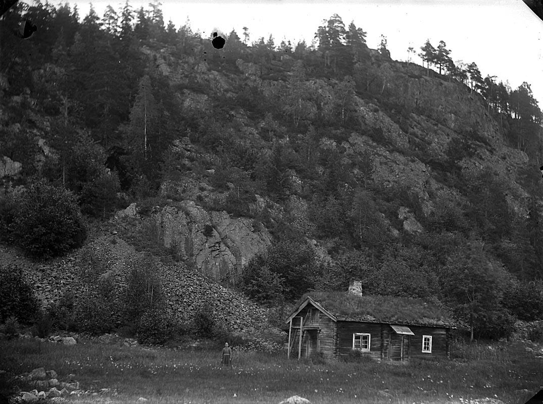 Gruvfogdestugan i Skåle på lite närmare håll. Det är troligen Johanna Persson som står till vänster i bilden. Hon var den sista som bodde i huset. Stugan övergavs 1915.