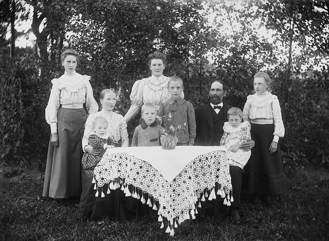 Gruppbild, familj 9 personer, "Klovstenafamiljen".