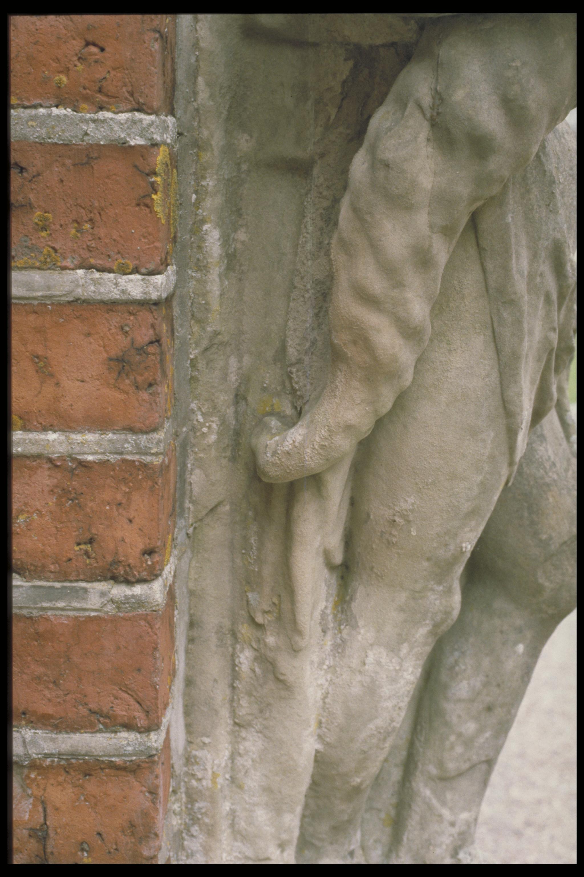 Detalj av portalskulptur, kvinnofigur, ymnighetshorn.