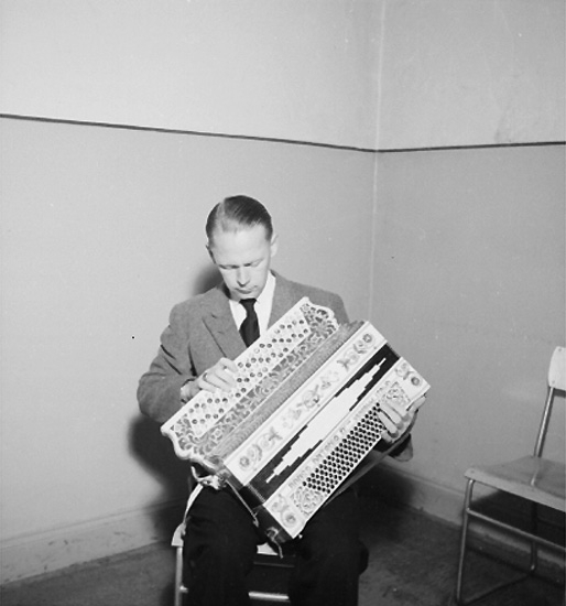 Whispering Band på Teknis, en man med musikinstrument (dragspel). Sannolikt Filip Andersson.