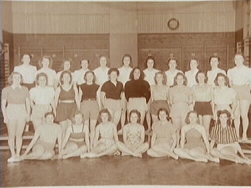KIF:s (Karlslunds idrottsförening) kvinnliga avdelning, 30 st i gymnastiksalen, Vasaskolan.