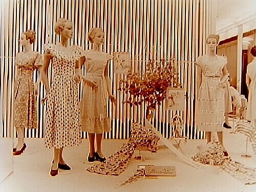 Jörnstedts skyltfönster, skyltdockor med klänningar.