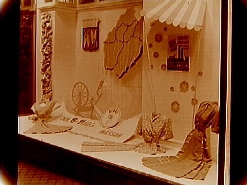 Skyltfönster, klänningar, reklam för Boråsmässan (12-21 augusti), textil och konfektion.