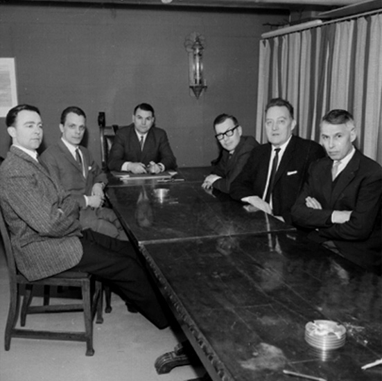 Rumsinteriör, grupp sex män vid bordet, styrelsen.