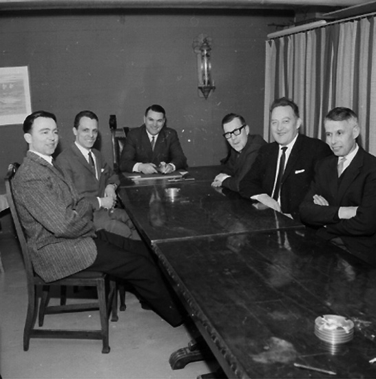 Rumsinteriör, grupp sex män vid bordet, styrelsen.