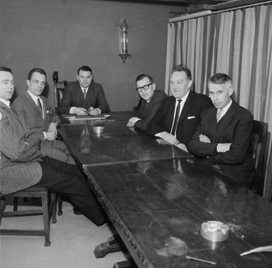 Rumsinteriör, grupp sex män vid bordet, styrelsen.