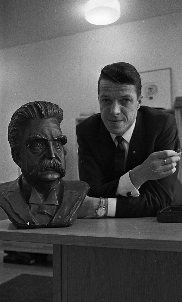 Partiombudsnamn Helge Hagberg lutar sig över ett skrivbord. Framför honom en byst på Hjalmar Branting.