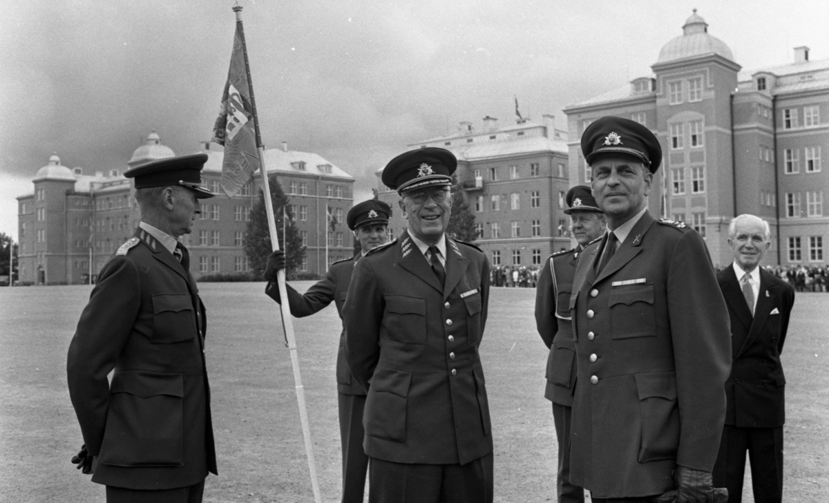 Kung Gustav VI Adolf besöker Örebro Livregementes Grenadjärer i Grenadjärsstaden. Flera män står uppställlda på regementsgården klädda i militäruniformer liksom kungen. En av militärerna har en befälsbricka runt halsen och en fana i handen. Till höger står en man i svart kostym, vit skjorta och ljus slips.
