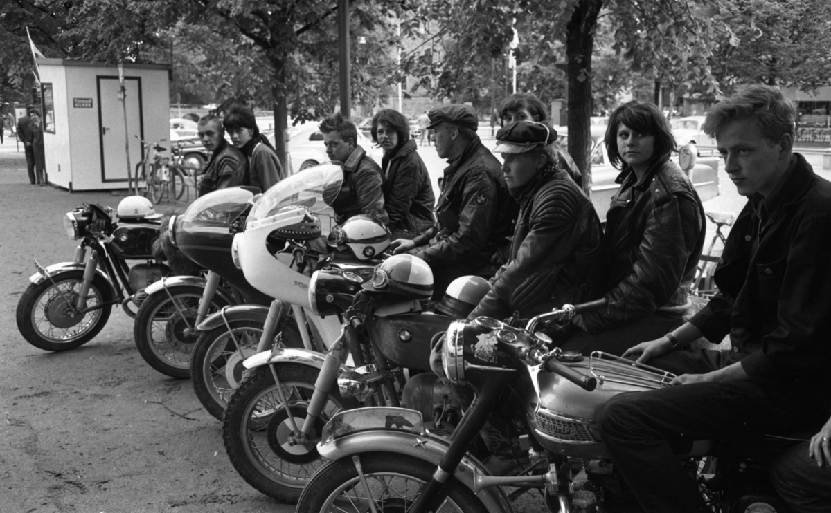 Tio stycken ungdomar med motorcyklar i förgrunden. Nyfiken kvinna kikar fram bakom glasskiosken.