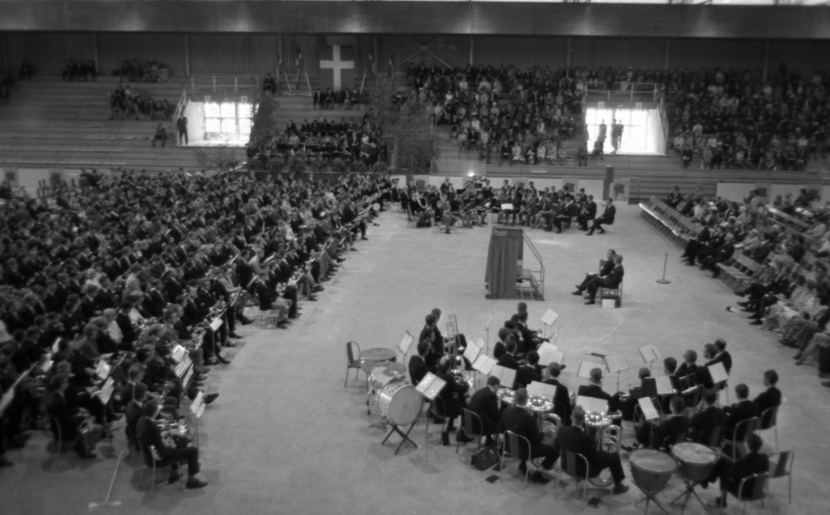 En skor skara blåsinstrumentsmusiker sitter samlade i en stor sal. Publik sitter på läktare i bakgrunden. Ett podium står i mitten av salen.