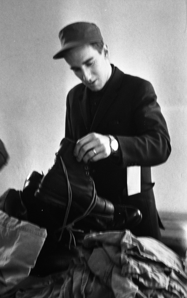 En ung soldat rycker in i lumpen och är i färd med att välja skor till sin militäruniform.