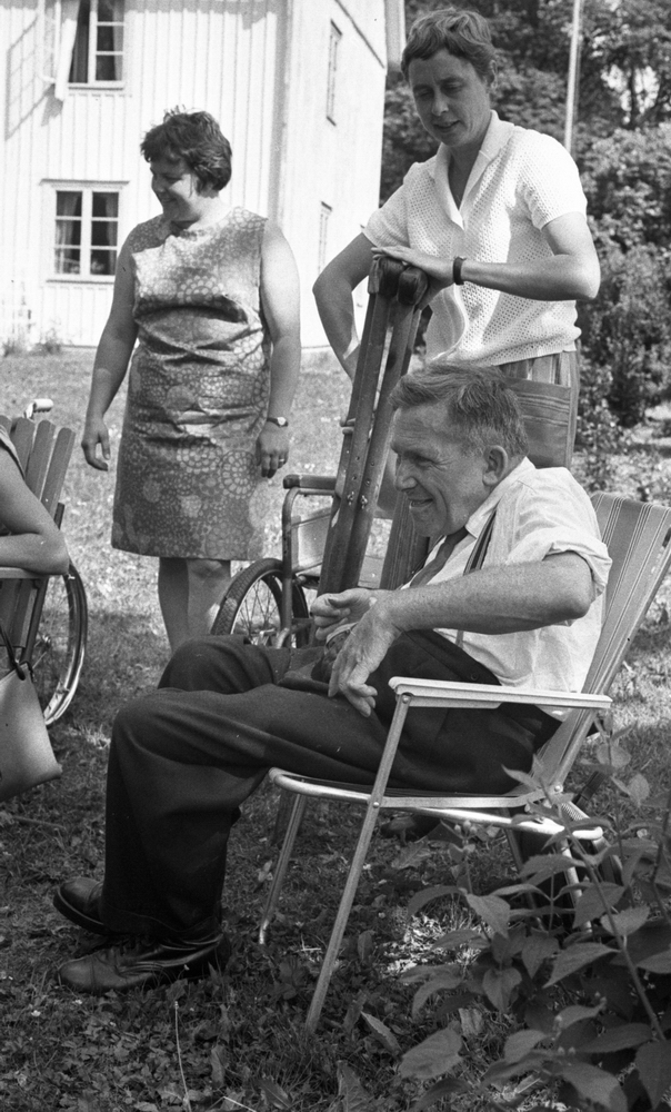 En handikappad man sitter i en stol. Till vänster om honom står en kvinna och håller i ett par kryckor. Bakom henne står en rullstol. Bredvid rullstolen står en kvinna i kort klänning.
